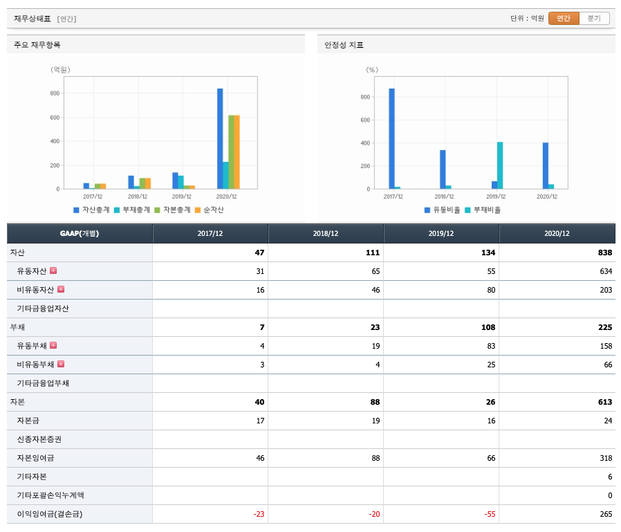 자산은 2017년 47억원, 2018년 111억원, 2019년 134억원, 2020년 838억원으로 증가하였습니다.