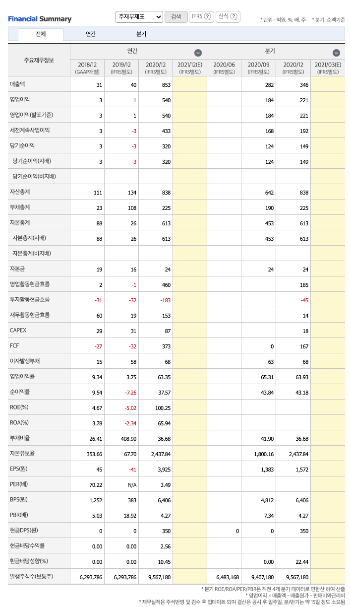 매출액 : 2017년 24억원, 2018년 31억원, 2019년 40억원, 2020년 853억원으로 증가하였습니다. 2020년은 전년동기 2059.2% 급증하였습니다. 2020년 분기별로 보면, 1분기 33억원, 3분기 282억원입니다.
