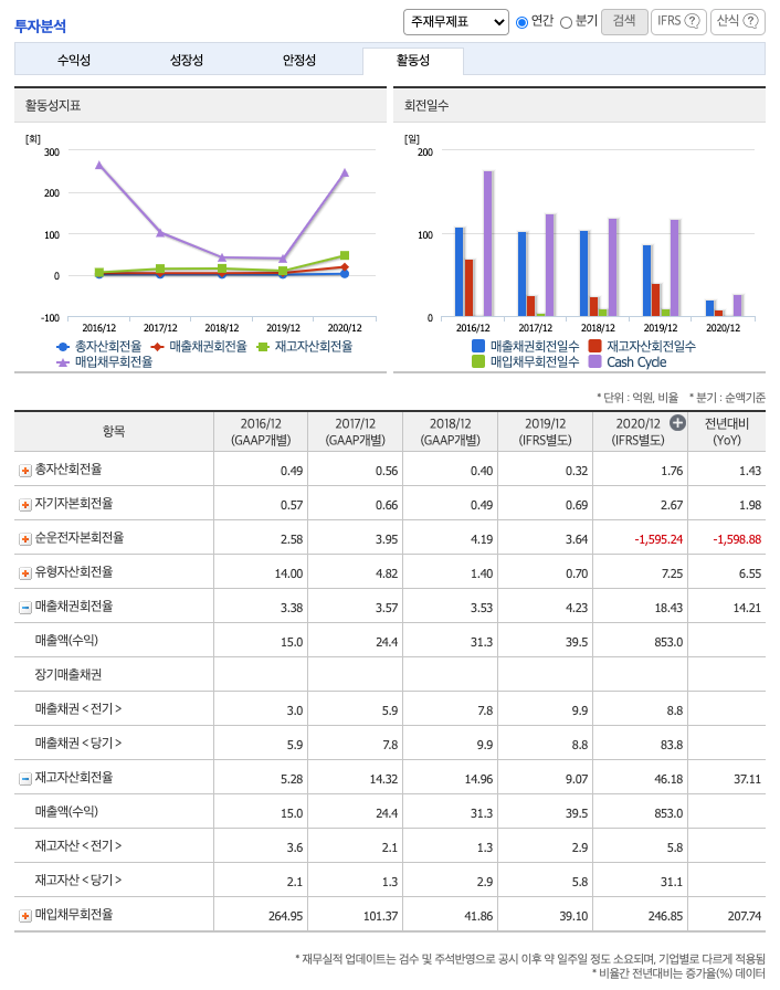 부채비율 : 2018년 26%, 2019년 408%로 급등하였으나, 2020년 36%으로 감소하였습니다. 표준(100%)보다 낮아 안정적입니다.