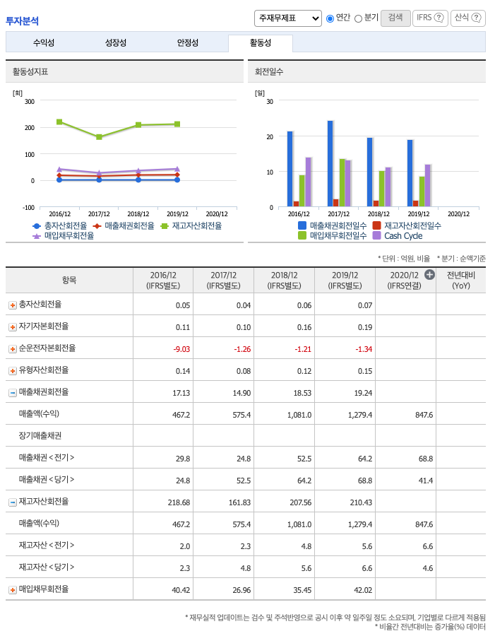재고자산회전율 : 2018년 약 5억원, 2019년 약 6억원, 2020년 약 4억원이고, 회전율은 2018년 약 207회, 2019년 약 210회로 안정적입니다.