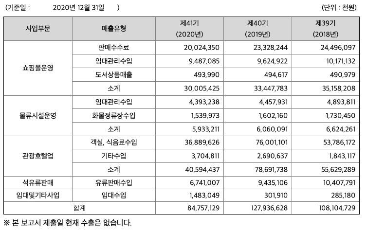 당사는 사업부문을 관광호텔업, 쇼핑몰운영, 물류시설운영, 석유류판매 및 부동산임대 등으로 구분하여 관리하고 있습니다.