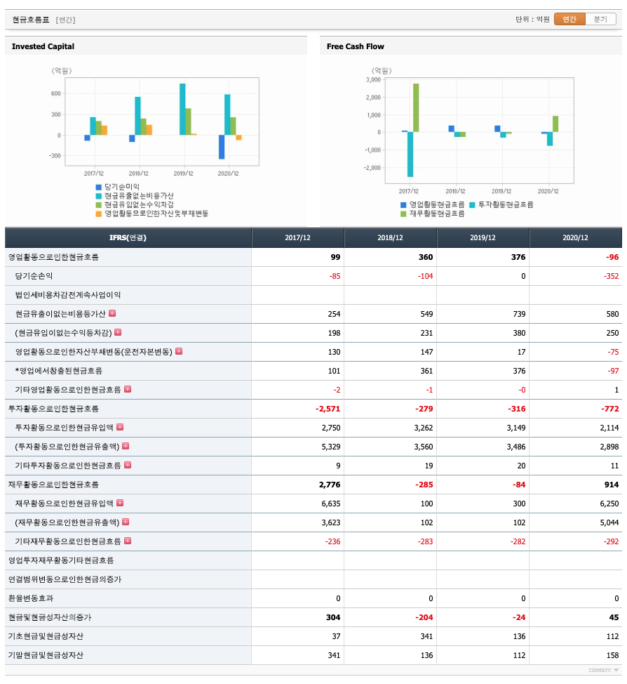 투자활동 현금흐름 : 2017년 -2571억원, 2018년 -279억원, 2019년 -316억원, 2020년 -772억원으로 투자활동 현금흐름이 원활합니다.