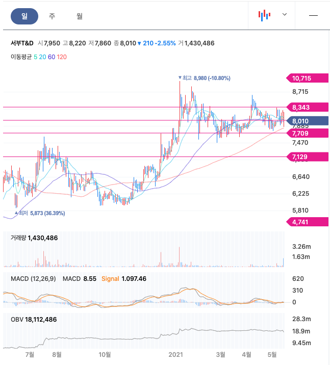 서부T&D는 20년 12월에 급등하여 21년 1월 최고점 8980원을 찍고, 조정을 받은뒤 보합중에 있습니다.
