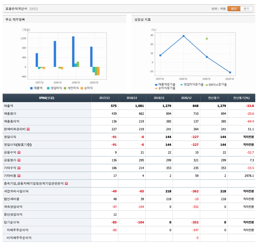 매출액 : 2017년 575억원, 2018년 1081억원, 2019년 1279억원으로 증가하였고, 2020년 848억원으로 감소하였습니다. 2020년은 전년동기대비 -33.8% 감소하였습니다. 2020년 분기별로 보면 1분기 216억원, 2분기 174억원, 3분기 226억원, 4분기 232억원입니다.
