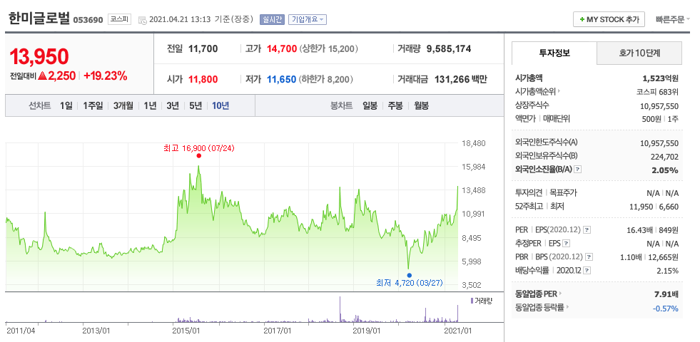 **매매포인트 : 한미반도체는 20년 3월 이후 꾸준히 우상향하였고, 21년 4월에 급등하여 최고점 14700원을 찍었습니다. 매수 적정가는 10,000원 초반입니다.