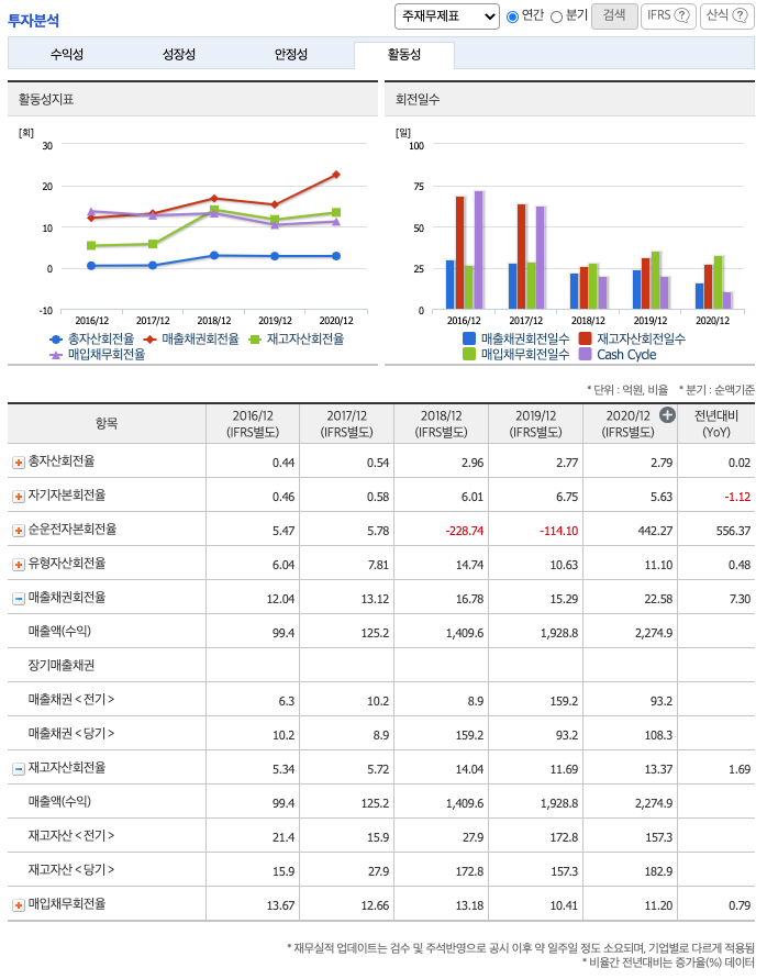 재고자산회전율 : 2018년 172억원, 2019년 157억원, 2020년 182억원이고, 회전율은 2018년 14회, 2019년 11회, 2020년 13회로 안정적입니다.