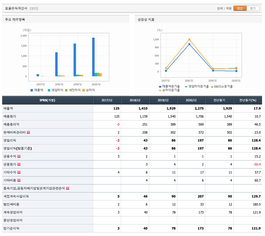 매출액 : 2017년 125억원, 2018년 1410억원, 2019년 1929억원, 2020년 2275억원으로 증가하고 있습니다. 2020년은 전년동기 17.9%증가하였습니다. 2020년 1분기 554억원, 2분기 536억원, 3분기 572억원, 4분기 613억원입니다.