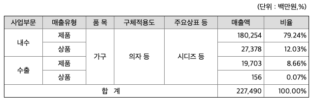 - 다만 정체된 사업으로 인해 매출 및 이익 악화가 수년간 지속되었고, 이에 당사는 주주가치 제고를 위한 결정으로 관계회사인 (주)시디즈의 의자 제조, 판매사업 일체를 2018년 4월 1일부로 양수하였습니다. 또한 의자 가구 시장에서의 통일성을 유지하기 위해 당사의 사명을 '주식회사 시디즈'로 변경 하였습니다.