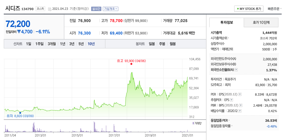 **매매포인트 : 시디즈는 20년 8월 급등한뒤에 보합상태에서 박스권으로 주가가 진행되다가 21년 4월에 급등하여 최고점 83900원을 찍었습니다. 매수적정가는 60,000원이하입니다.
