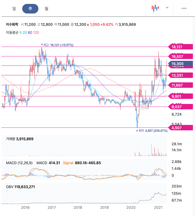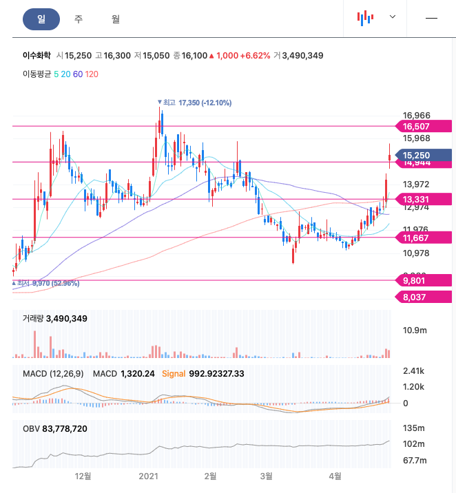 **매매포인트 : 이수화학은 20년 10월 급등, 11월 급등해서 21년 1월에 최고점 17,350원을 찍고, 조정을 받다가 21년 4월에 반등을 주고 있습니다. 매수 적정가는 13,000원이하입니다.