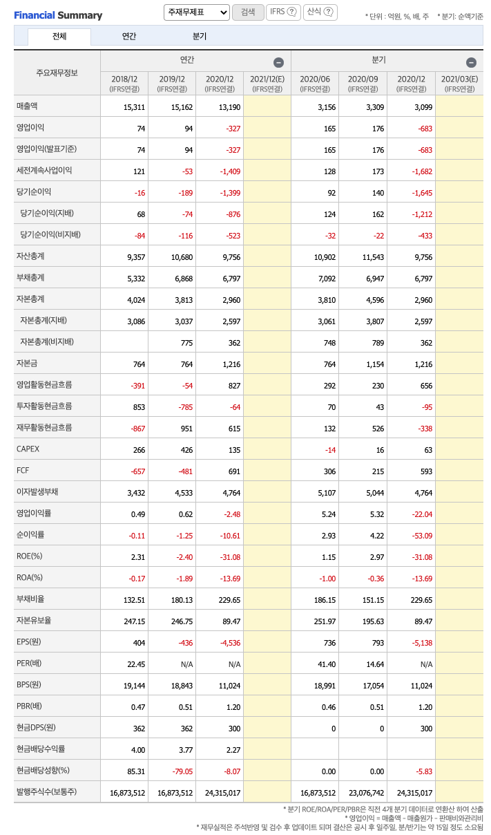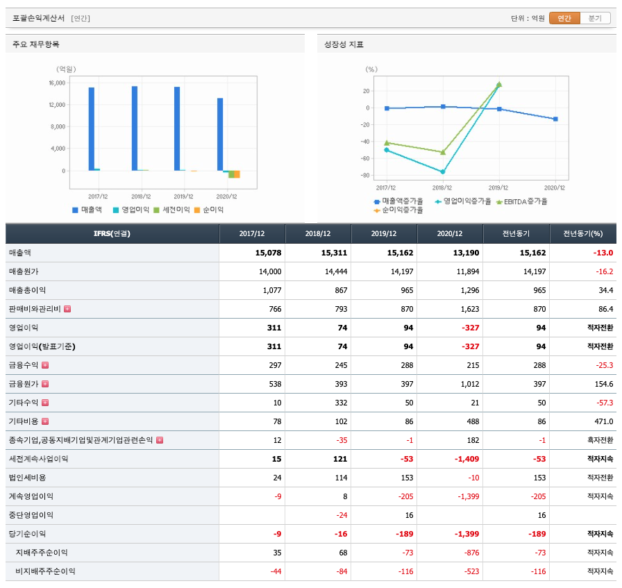 영업이익 : 2017년 311억원, 2018년 74억원으로 감소하였고, 2019년 94억원으로 증가하였습니다. 2020년 -327억원으로 적자전환하였습니다. 2020년 분기별로 보면 1분기 15억원, 2분기 165억원, 3분기 176억원, 4분기 -683억원입니다.