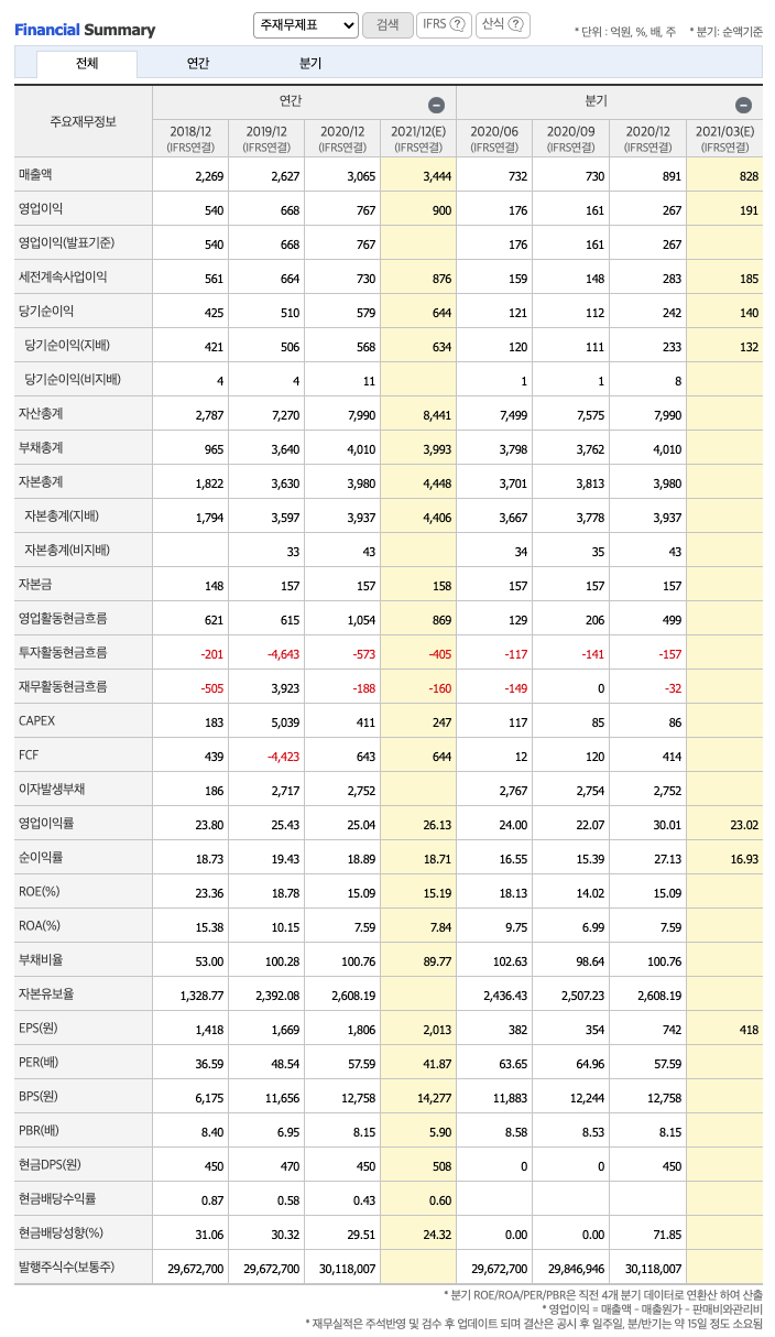 CAPEX(Capital expenditures,자본적 지출,미래의 이윤을 창출하기 위해 지출한 비용을 말함) : 2018년 183원, 2019년 5039억원, 2020년 411억원으로 CAPEX가 좋습니다. 2021년은 247억원으로 추정됩니다.