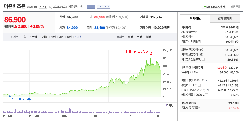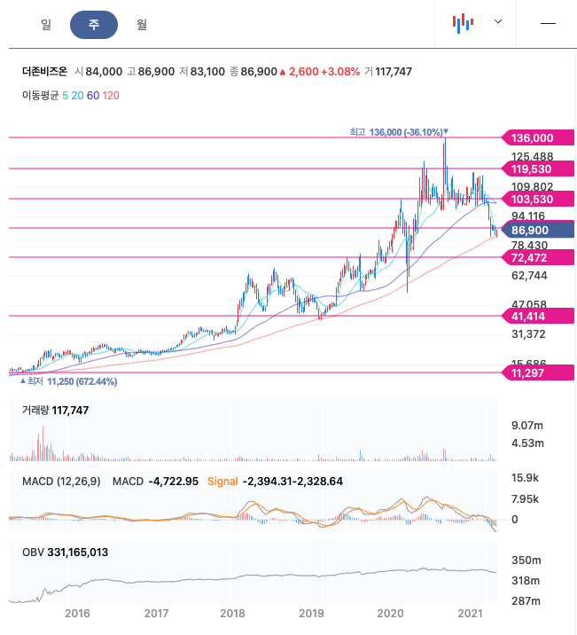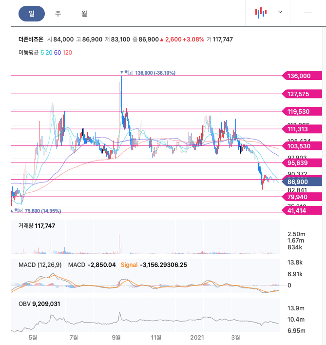 더존비즈온은 20년 5월에 주가가 급등하였고, 20년 9월에 최고점 136,000원을 찍은 뒤 조정을 받고 있습니다. 매수적정가는 85,000원이하입니다.