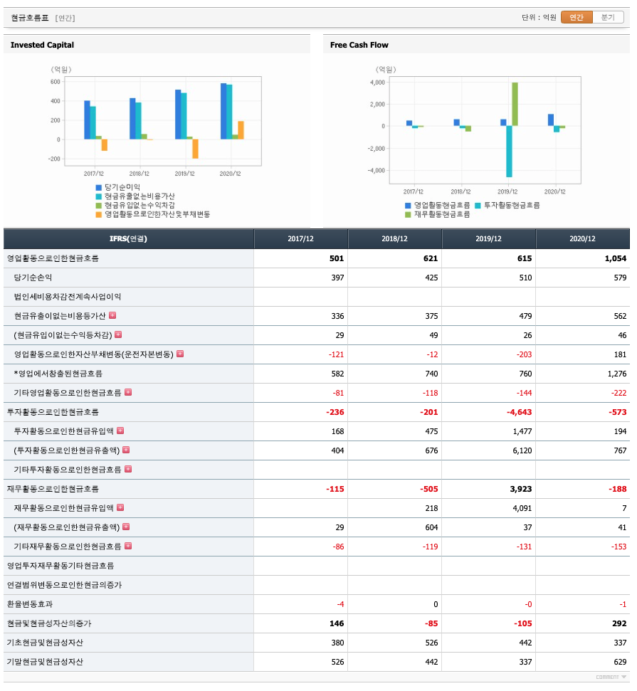 FCF(미래현금흐름) : 2018년 439억원, 2019년 -4423억원, 2020년 643억원으로 미래현금흐름이 좋습니다. 2021년은 644억원으로 추정됩니다.
