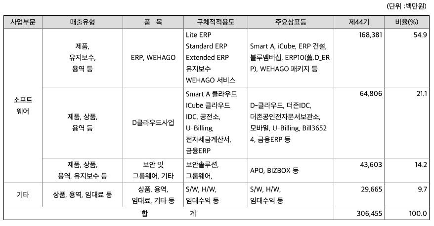 주요사업은 크게 기업정보화솔루션, 클라우드 서비스, 그룹웨어, 정보보안, 모바일솔루션, 전자금융서비스/전자세금계산서, 전자팩스 부문으로 나눌 수 있으며 세부적으로는 1) 기업 정보화 솔루션의 자체 개발과 마케팅 및 서비스 회계프로그램 및 ERP, IFRS, 그룹웨어, 정보보안 2) 기업용 솔루션 개발, 판매, 컨설팅, 구축, 유지보수 3) 전자세금계산서, 바로수금서비스, U-billing 등 청구, 고지, 결제(P/G) 관련 전자금융서비스 4) 모바일 오피스 개발, 판매 5) D-클라우드 센터 기반 퍼블릭 클라우드 사업 전개/ 프라이빗 클라우드 사업 전개 6) 온라인 비지니스 플랫폼 서비스 7) 그린팩스, 클라우드팩스, 전자팩스 사업 7) 공인전자문서센터, 공인전자화문서작업장, 공인전자문서중계자 등의 사업분야를 영위하고 있습니다.