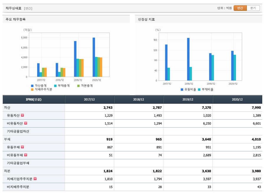 자산은 2017년 2743억원, 2018년 2787억원, 2019년 7270억원, 2020년 7990억원으로 증가하였습니다.