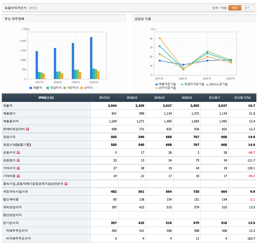 영업이익 : 2017년 505억원, 2018년 540억원, 2019년 668억원, 2020년 767억원으로 증가하였습니다. 2020년은 전년동기대비 14.9% 증가하였습니다. 2020년 분기별로 보면 1분기 163억원, 2분기 176억원, 3분기 161억원, 4분기 267억원입니다.
