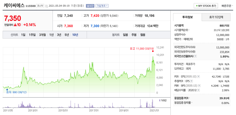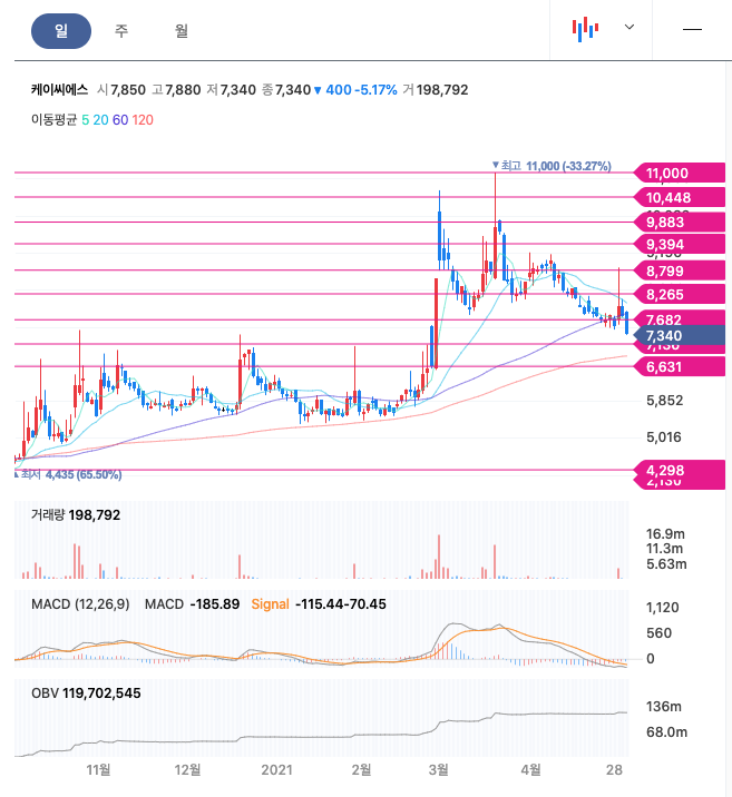 케이씨에스는 21년 3월에 급등하여 최고점 11,000원을 찍고, 조정을 받고 있습니다. 매수 적정가는 7,000원이하입니다.