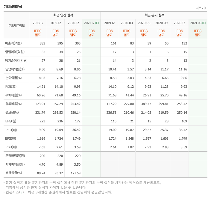 매출액 : 2017년 293억원, 2018년 333억원, 2019년 395억원으로 증가하였고, 2020년 305억원으로 감소하였습니다. 2020년은 전년동기대비 -22.8% 감소하였습니다. 2020년 분기별로 보면 1분기 83억원, 2분기 39억원, 3분기 50억원, 4분기 132억원입니다.