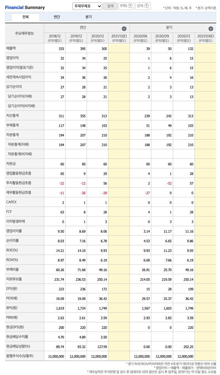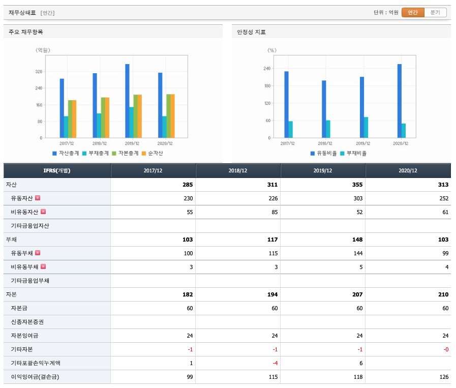 유보율 : 2018년 231%, 2019년 236%, 2020년 250%로 증가하고 있고, 유보율이 낮아 사내 유동자산이 좋지 않습니다.