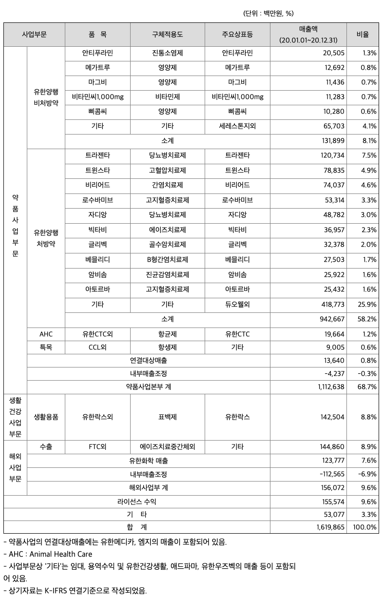 제98기에 약품사업부문은 COVID-19로 인한 전세계적 경기침체와 공정거래 자율준수프로그램 강화 등 지속되는 제약산업 규제 및 주요 품목의 약가 인하 등으로 인한 어려운 환경 속에서도 차별화된 신제품을 출품하고, 임직원 모두가 목표 달성을 위한 뜨거운 열정과 강한 책임의식으로 맡은 바 업무에 최선을 다 한 결과, 전년대비 0.5% 성장하였습니다. 주요품목으로는 경구용 혈당강하제 트라젠타가 약 1,200억원의 매출을 실현하였고, 트윈스타, 비리어드, 로수바미브, 자디앙 등 총 27개 품목이 100억원 이상의 실적을 나타내었습니다. 또한, 만성골수성백혈병 치료제 글리벡, 위십이지장궤양 치료제 파리에트 등 전략적 신제품을 출시하여, 성공적으로 시장에 안착시켰습니다. 제99기에도 약품사업부문은 회사가 직접 개발한 신약 ‘렉라자’, 자회사인 애드파마에서 개발한 개량신약 등 경쟁력 있는 신제품을 지속적으로 출품하고, 기존 품목을 육성하여 시장점유를 확대하며, 품목 포트폴리오 재구성을 통해 수익성을 개선할 수 있도록 최선의 노력을 다 하겠습니다.