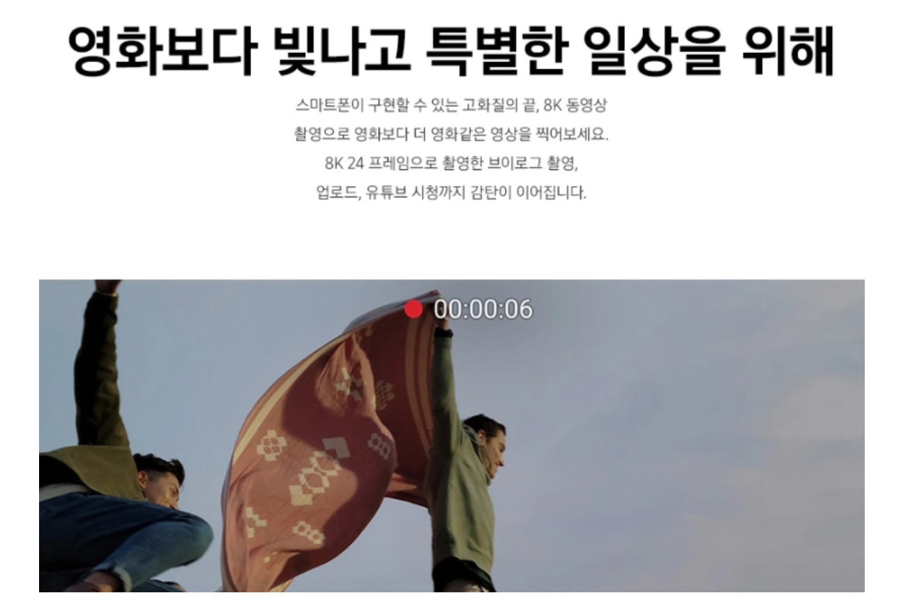 영화보다 빛나고 특별한 일상을 위한 스마트폰에서 구현 할 수 있는 최고의 화질인 8K 동영상 촬영이 가능해졌습니다. DSLR이나 미러리스가 아닌 스마트폰에서 8K 동영상을 촬영할 수 있다는 것은 이제는 스마트폰 하나면 어떤 환경에서도 부족함없는 동영상 촬열이 가능해졌다는 말이겠지요.