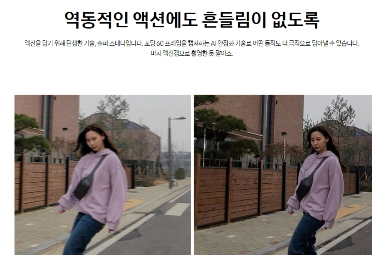 역동적인 액션에도 흔들림 없이 촬영이 가능한 슈퍼 스테디 기능이 탑재되어 있습니다. 액션을 담기 위해서 탄생한 기술이 바로 슈퍼 스테디 기능입니다. 초당 60프레임을 캡처하는 AI안정화 기술로 어떤 동작에도 더 극적으로 담아낼 수 있습니다. 액션캠이 따로 필요가 없어졌습니다.