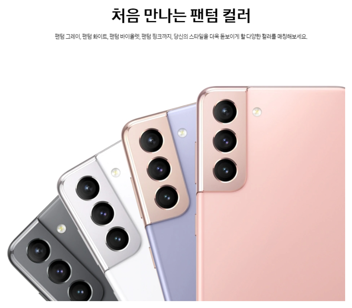 갤럭시 S21은 4가지 컬러로 출시되었습니다. 팬컴 그레이, 팬텀 화이트, 팬텀 바이올렛, 팬텀 4가지 색상으로 선택의 폭을 넓혀주었습니다. 무난한 컬러를 선호한다면 화이트를 선택하세요. 좀 더 튀고 화려한 컬러를 원하신다면 바이올렛이나 핑크를 구매하시면 됩니다.