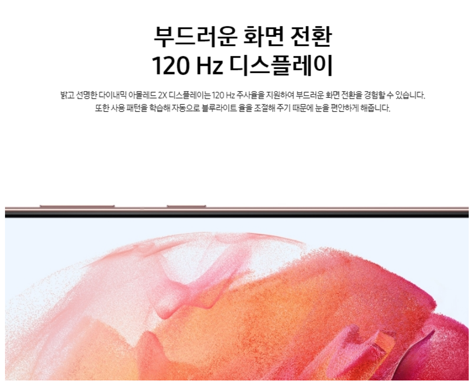 갤럭시 S21모델은 120Hz 주사율이 탑재되어있습니다. 밝고 선명한 다이내믹 아몰레드 2X 디스플레이에 120Hz 주사율을 지원하여 부드러운 화면 전환을 경험할 수 있습니다. 또한 사용 패턴을 학습해 자동으로 블루라이트를 조절해 주기 때문에 눈도 훨씬 편안하게 해주고 있습니다.