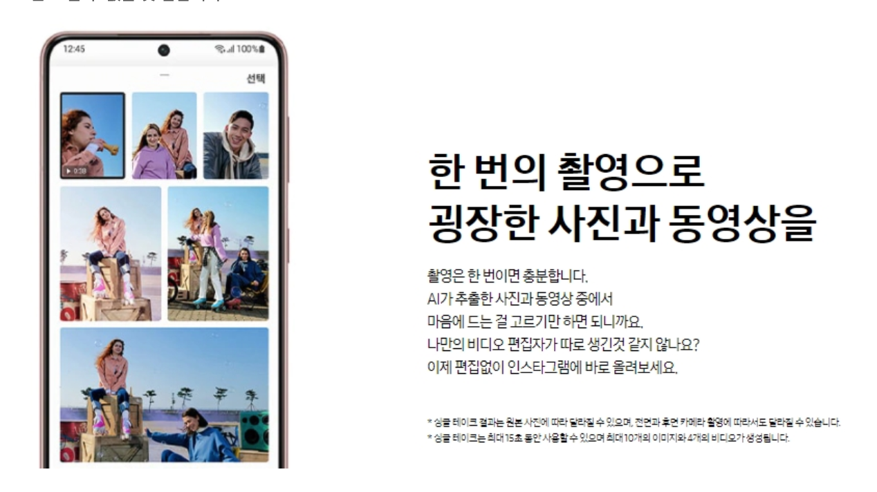 한 번의 촬영으로 굉장한 동영상을 촬영할 수 있는 싱글 테이크 기능이 있습니다. 한번 촬영하면 AI가 추출한 사진과 동영상 중에 마음에 드는 걸 고르기만 하면 됩니다. 편집 없이 SNS에 바로 올릴 수 있습니다. 싱글테이크는 최대 15초 동안 사용할 수 있습니다. 최대 10개의 이미지와 4개의 비디오가 생성이 됩니다.