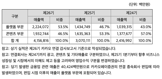 당사는 콘텐츠와 엔터테인먼트 영역에서 본격적인 성장과 글로벌 시장 진출 가속화를 위해 제 26기 정기주주총회에서 멜론사업 분할과 관련된 안건을 상정하였습니다. 마케팅비 증가와 음악 저작권료 상승 등으로 국내 스트리밍 시장의 경쟁이 심화되고 있고 글로벌 스트리밍 플랫폼사들의 과감한 투자로 글로벌 뮤직 스트리밍 구독 시장의 경쟁도 심화되고 있습니다. 당사는 최근 콘텐츠 시장이 빠르게 변화하는 상황 속에서, 음악 사업 본질에 대한 고민을 바탕으로 시장의 변화에 능동적으로 대처하고 효율적인 의사 결정 체계를 마련하기 위해 멜론 사업부를 멜론컴퍼니(가칭)로 신설하고자 합니다. 이후 전략적인 파트너쉽 모색 및 인수, 합병 등의 다양한 재무구조 변경을 통해 콘텐츠 비즈니스의 본격적인 성장을 위한 최적의 구조를 모색하고 음악 사업 부문에 대한 사업 가치가 재평가 받을 수 있도록 지속적인 경쟁력을 확보내 나가려고 합니다.