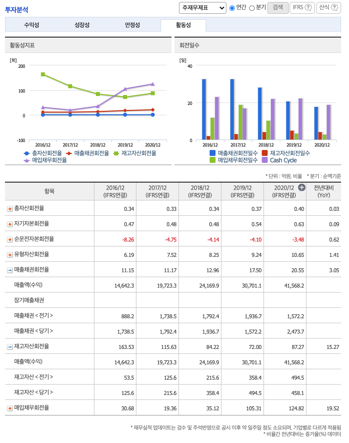매출채권회전율 : 2018년 1936억원, 2019년 1572억원, 2020년 2473억원이고, 회전율은 2018년 약 12회, 2019년 약 17회, 2020년 약 20회로 안정적입니다.