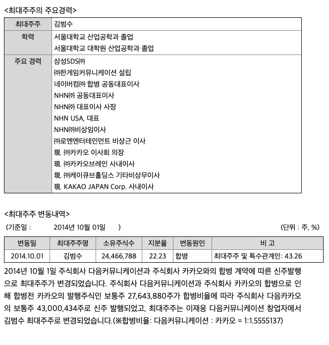 2018년 9월 ㈜카카오엠과의 합병을 통해 뮤직콘텐츠사업의 내재화를 진행하였습니다. 이를 통해 디지털 콘텐츠 흐름에 부합하는 새로운 서비스를 소개하고 글로벌시장으로 영역확대를 전개함으로써 지속적인 성장을 이어갈 수 있는 기반이 마련되었습니다.