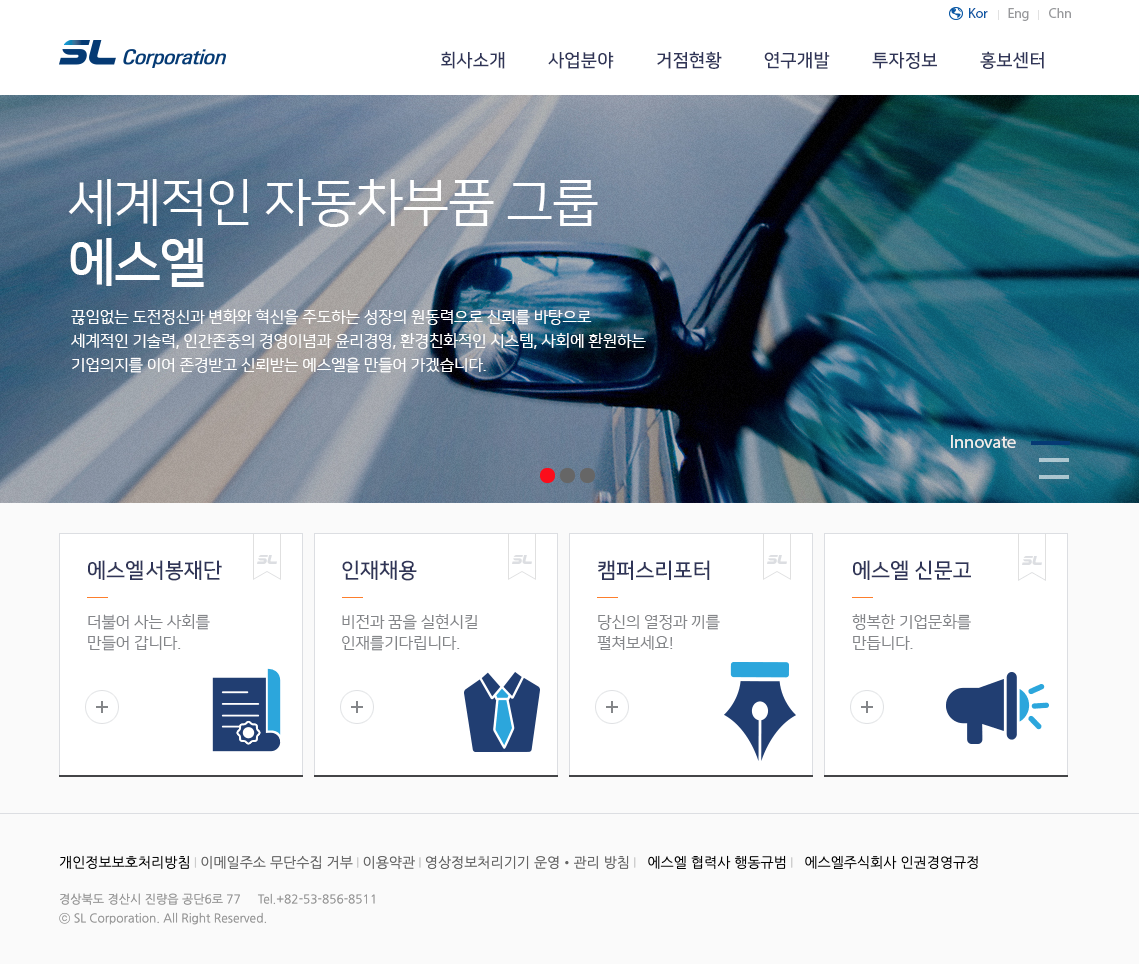 당사는 자동차 부품중 각종 램프, 샤시 부품 등을 주로 생산하여 국내외의 현대차, 기아차, GM, Ford, Geely 등의 OEM에 납품하고 있습니다. 특히 1986년 미국 G.M.社와 합작으로 (주)성산을 설립, 본격적인 해외시장 진출의 발판을 마련하였고, 1987년 (주)에스엘라이팅을 설립, 국내 최초로 신소재(BMC)를 이용한 Head Lamp를 개발하여 수출용 자동차에 적용하였으며, 또한 해외에서도 가격과 품질의 우수성을 인정받아 1997년부터 2020년까지 미국 G.M.社로부터 G.M.에 납품하는 전세계 모든 부품업체를 대상으로 품질, 서비스, 기술, 가격 등에서 우수한 업체를 선정하여 시상하는 QSTP AWARD를 23회 수상하였습니다. 수상 부품협력업체 중 우수한 4개업체만 수여하는 신설된 Overdrive상에 한국업체로는 유일하게 시상함으로써 G.M.내에서의 위치를 확고히 하여 전략적 파트너로서의 인정을 받았습니다. 그리고, '86년 2월에는자동차 부품업체 중 최초로 기술연구소를 설립하여 시장 트랜드를 선도하는 제품을 개발하여 위해 현재, 총 1,400여명의 우수한 연구인력들이 연구개발에 매진하고 있습니다. 또한, 2002년 4월 18일에는 자동차부품산업의 모듈화 추세에 발 맞추어, 독일의 HBPO社와 합작하여 프론트 엔드 모듈 사업(Front End Module)을 선도하기 위해 (주)SHB를 설립하였습니다.