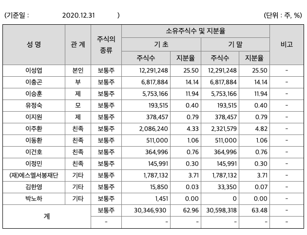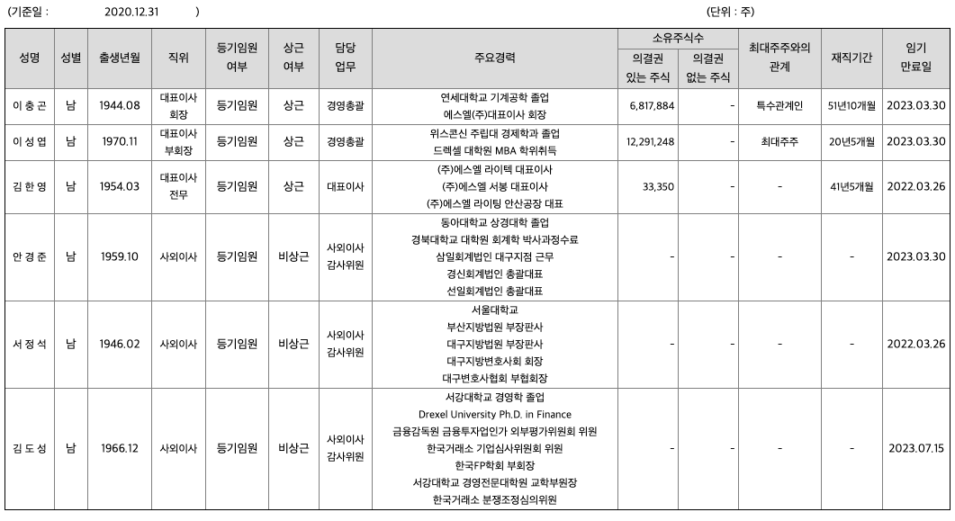 생산설비, 기술 및 경영자원의 통합을 통한 시너지 효과를 창출하고 비용절감을 통한 경영의 효율성을 달성하며, 규모화로 글로벌 경쟁력을 제고하기 위하여 2019년 4월 1일부로 에스엘라이팅(주)을 흡수합병하였습니다. 또한, 빠른 의사결정을 통하여 급변하는 국내외 경영환경 변화에 적극적으로 대처하고, 내부 기술 확보를 통한 비용절감을 통해 기업가치를 제고하기 위해, 2020년 01월 01일을 합병기일로 에이치에스엘 일렉트로닉스(주)를 흡수합병하였습니다.