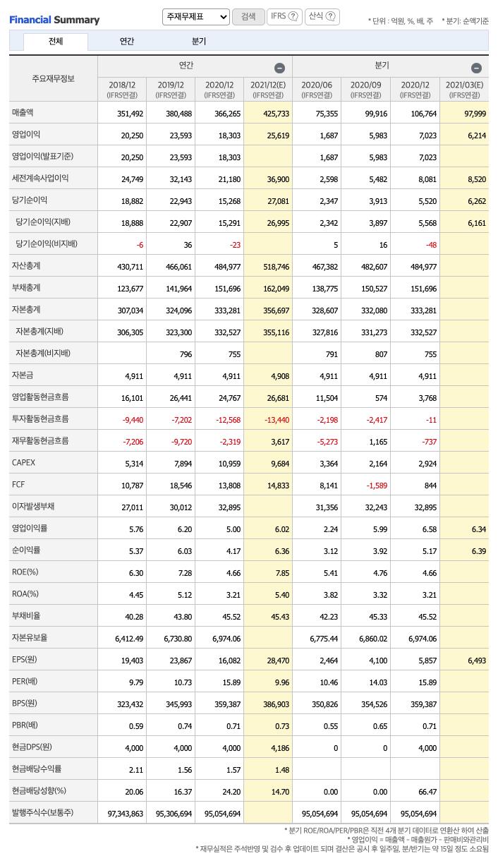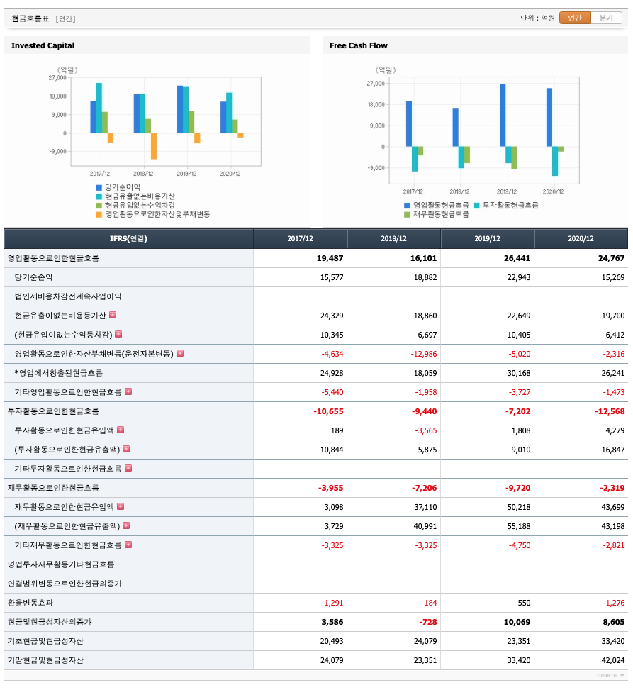 FCF(미래현금흐름) : 2018년 10787억원, 2019년 18546억원, 2020년 13808억원으로 미래현금흐름이 좋습니다. 2021년은 14833억원으로 추정됩니다.