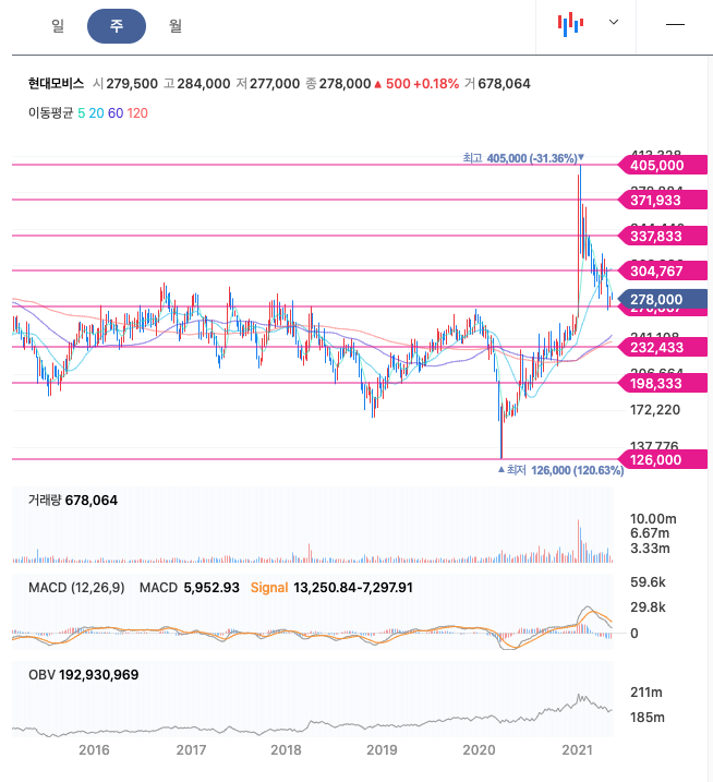 현대모비스는 21년 1월에 급등하여 최고점 405,000원을 찌고 조정을 받고 있습니다. 매수 적정가는 280,000원이하입니다.