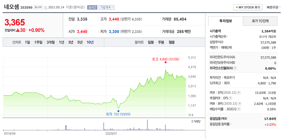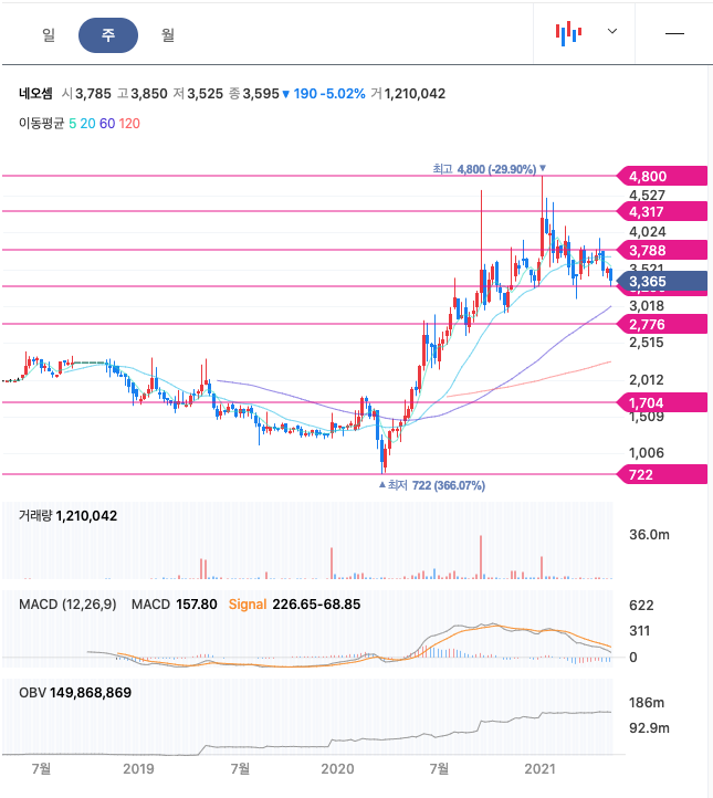 네오셈은 20년 계속해서 주가가 우상향하였고, 21년 1월 최고점 4800원을 찍고 조정을 받고 있습니다. 매수적정가는 3200원초반입니다.