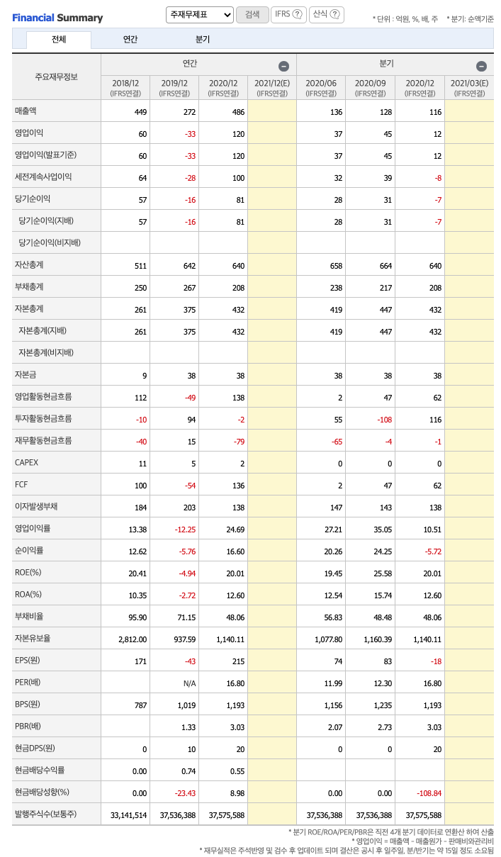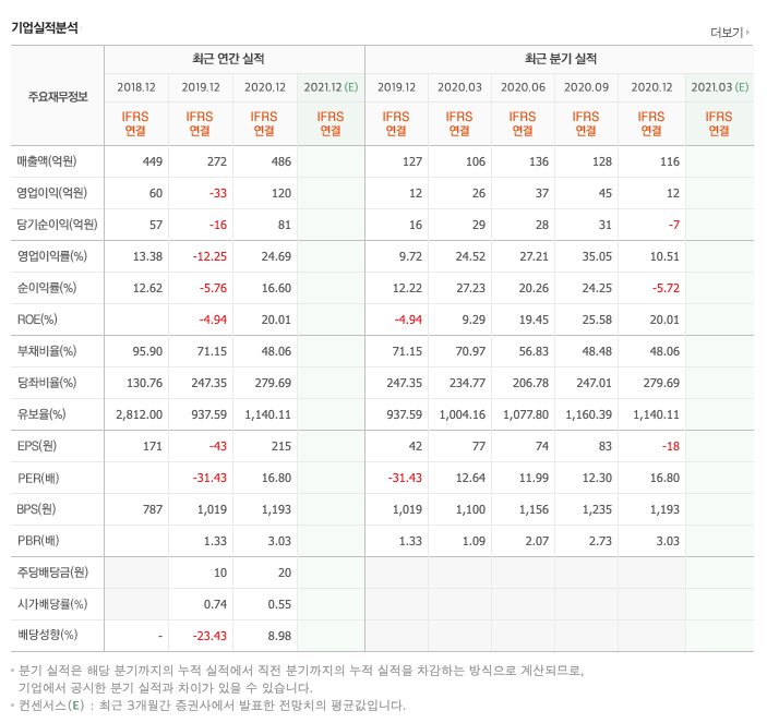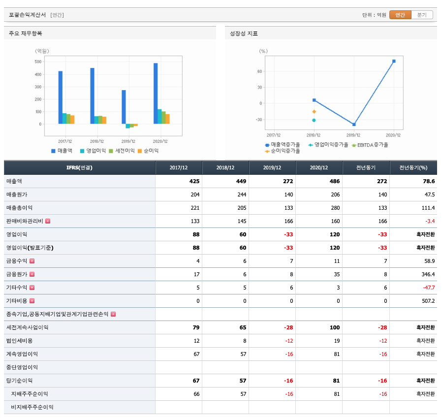 매출액 : 2017년 425억원, 2018년 449억원으로 증가하였고, 2019년 272억원으로 감소하였고, 2020년 486억원으로 증가하였습니다. 2020년은 전년동기대비 78.6% 증가하였습니다. 2020년 분기별로 보면 1분기 106억원, 2분기 136억원, 3분기 128억원, 4분기 116억원입니다.
