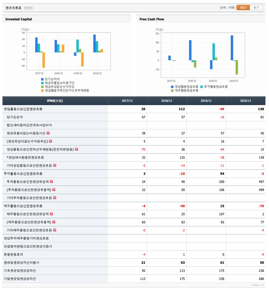 영업활동 현금흐름 : 2017년 26억원, 2018년 112억원, 2019년 -49억원, 2020년 138억원으로 2019년을 제외하고 영업활동 현금흐름이 원활합니다.