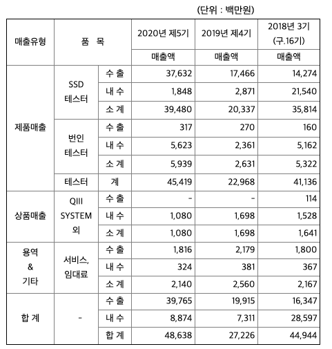 여기에 더하여 기존 메뉴얼 방식에 의존하던 테스트 방식에서 효율적인 자동화 테스트 솔루션으로의 전환에 대한 시장의 요구가 강해지고 있어, 2020년부터 자체 기술로 새롭게 시장에 진입한 자동화 테스트 솔루션의 의미있는 실적 기록을 기대 하고 있습니다. 특히 SSD의 기술발전에 따라 기존의 3세대 SSD에서 4세대 SSD로 시장이 빠르게 변화되고 있으며, 이미 5세대 SSD의 개발을 시작한 고객사도 있어, 이에 따른 신규 검사장비의 수요도 증가할 것으로 기대하고 있습니다.