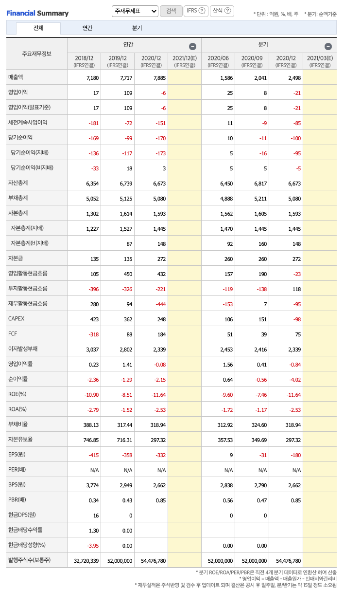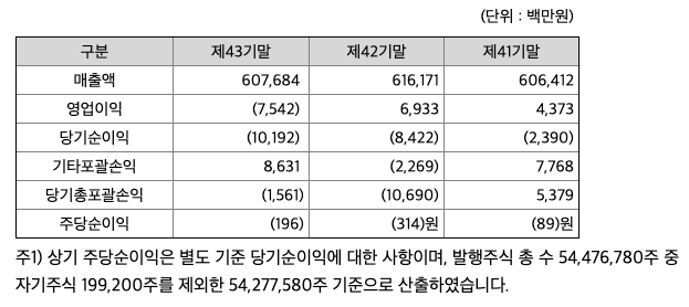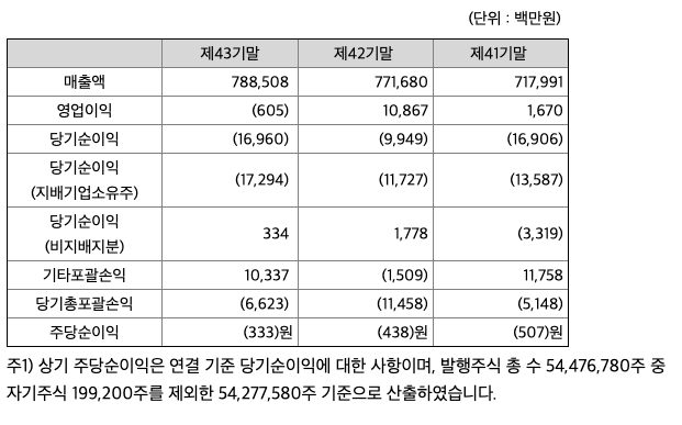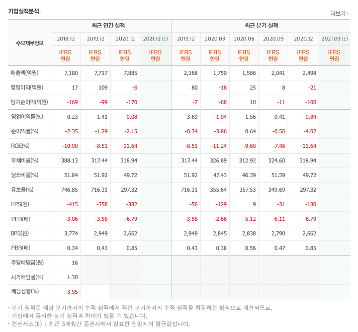 영업이익 : 2017년 -143억원, 2018년 17억원으로 흑자전환하였고,, 2019년 109억원으로 증가하였고, 2020년 -6억원으로 적자전환하였습니다. 2020년 분기별로 보면 1분기 -18억원, 2분기 25억원, 3분기 8억원, 4분기 -21억원입니다.