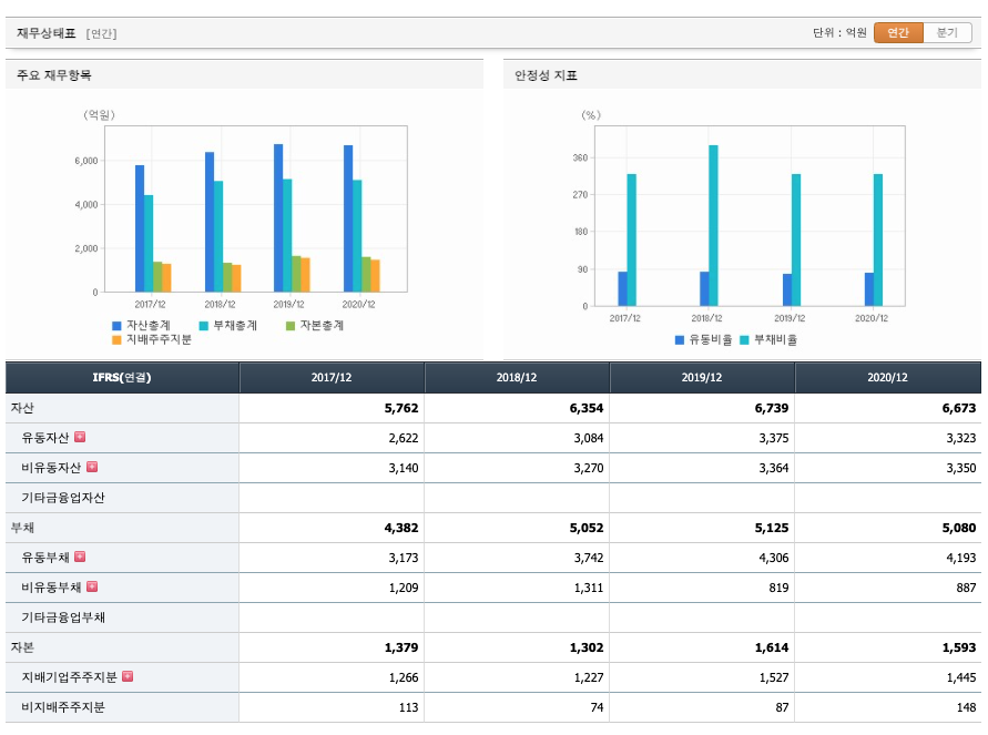 부채비율 : 2018년 약 388%, 2019년 약 317%, 2020년 약 318%로 보합새를 보이고 있으며, 표준(100%)보다 상당히 높아 부채비율이 불안정합니다.