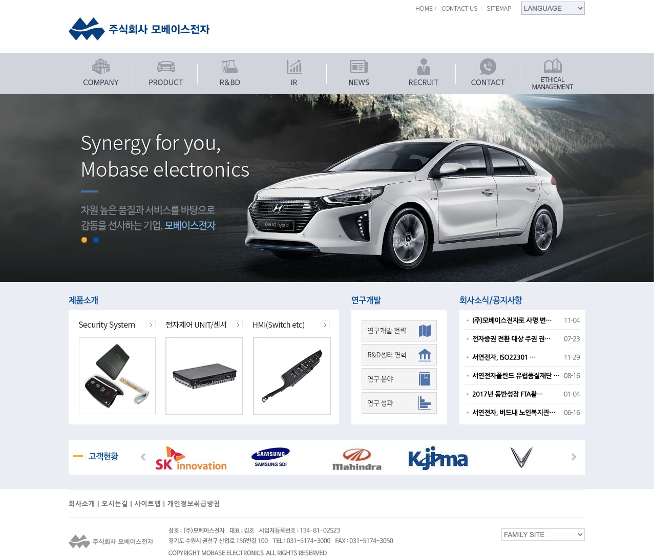 당사는 우수한 품질의 자동차용 Smart Key System, Car Lock Set, Multifunction Switch 및 Power Window Switch 등의 스위치류, BCM, 무선충전기, 집중형조작계, Immobilizer 등의 전자Unit 등의 부품과 Magnesium Diecasting 부품을 생산, 공급하는 동종업계의 선두주자입니다. ISO14001, ISO/TS16949 인증을 획득하여 품질 및 환경경영 측면에서 세계적으로 인정받고 있으며, CMMI Level 3 국제품질 인증을 획득하여 자동차 제품 개발 전문업체로서 지속적인 성장과 최고 수준의 제품개발 품질 확보/개선을 한 단계 더 강화하여 품질 만족을 위한 조직 프로세스 경영을 정착화 하였습니다. 그리고 끊임없는 연구개발을 통하여 기술력 강화, 생산능력의 극대화를 이룩함으로써 자동차 전장품 업계의 전문업체로서 입지를 확고히 하고 있습니다. 또한 2014년 5월 중소기업청 주관 '월드클래스 300 프로젝트' 대상기업으로 선정되어기술확보, 시장확대, 인력확보, 자금지원, 각종 컨설팅 관련하여 지원을 받게 되었고, 2018년 품질경쟁력 우수기업으로 선정(6년 연속 수상) 및 품질경쟁력 혁신부문 국가품질혁신상(대통령상)을 수상하는 등 보다 높은 품질 수준 달성을 위해 노력하고 있습니다.