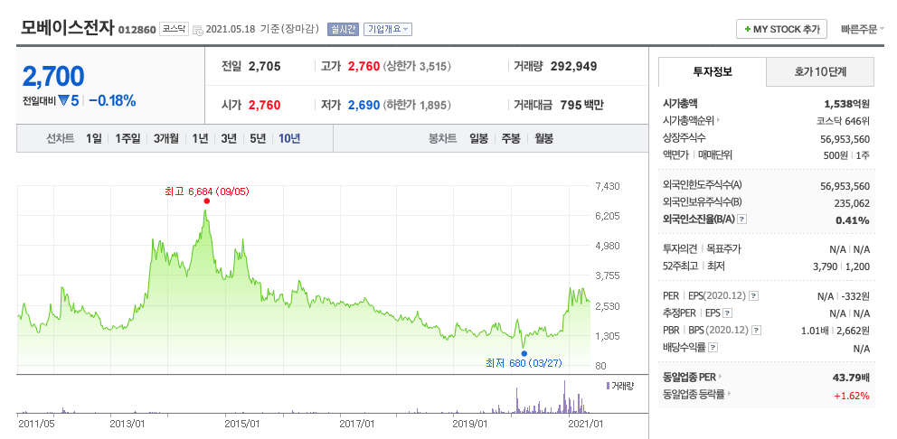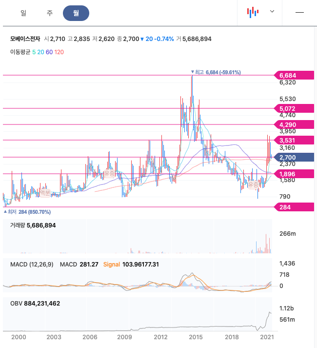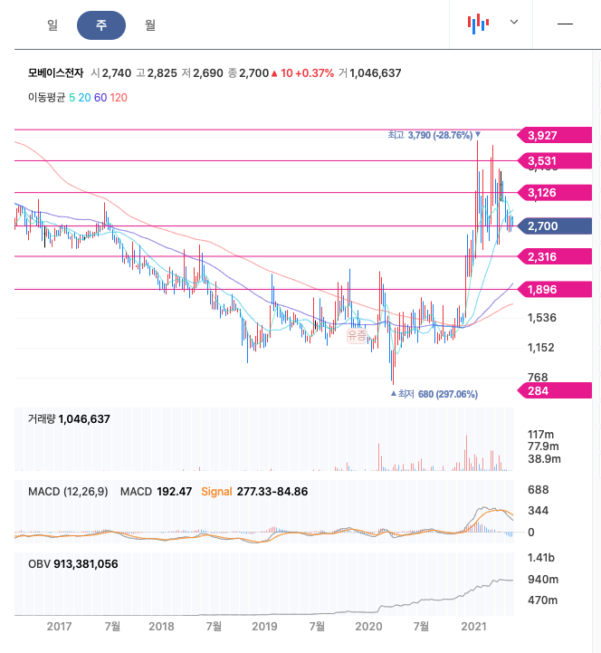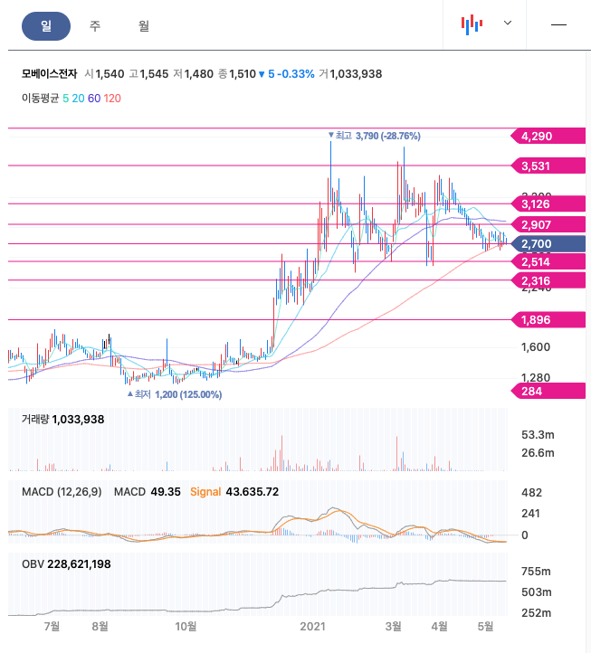 모베이스전자는 20년 12월에 급등하여 21년 1월에 최고점 3790원을 찍고 보합상태에 있다가 21년 4월부터 조정을 받고 있습니다.