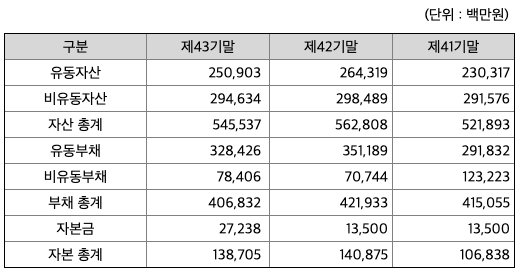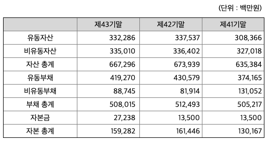 자산의 총계는 부채가 자본의 비율보다 약 3배정도 높아 재정건전성이 안정적이지 않습니다.