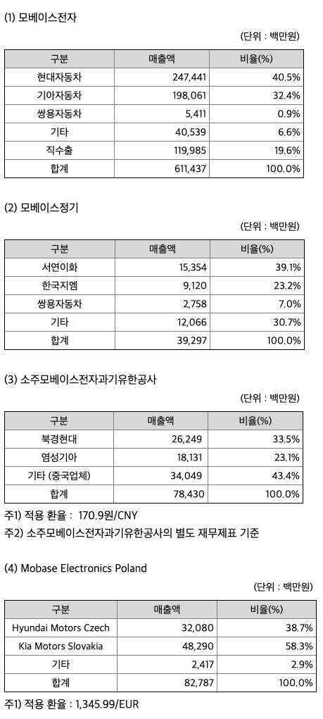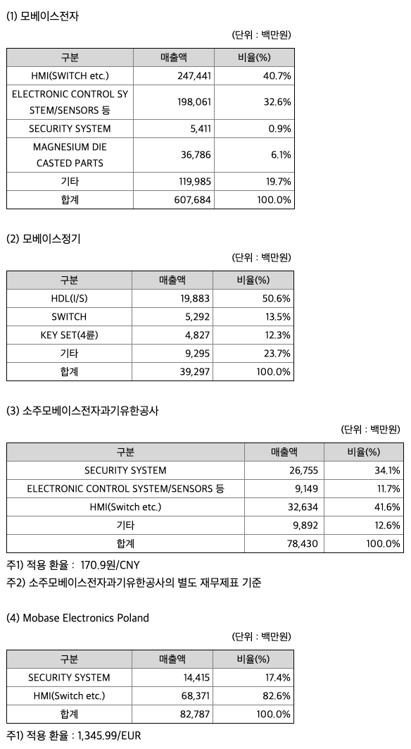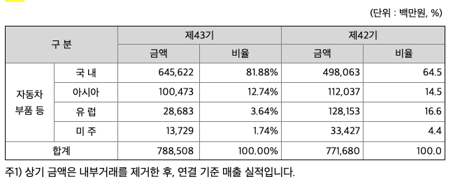 연결실체는 자동차 부품 단일 영업부문에 대하여 수직계열화 및 현지화를 통하여 사업을 영위하고 있으며, 영업부문별로 구분하여 별도의 공시를 하지 않습니다. 소재 지역별 자회사별 주요 재무정보는 아래와 같습니다