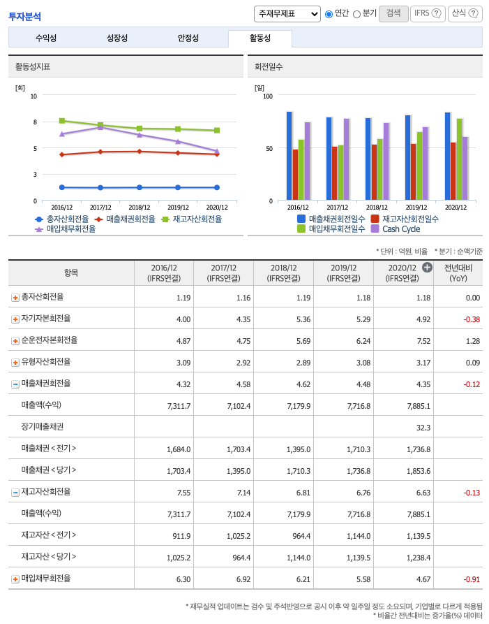 매출채권회전율 : 2018년 약 1710억원, 2019년 약 1736억원, 2020년 약 1853억원이고, 회전율은 2018년 약 4회, 2019년 약 4회, 2020년 약 4회로 안정적입니다