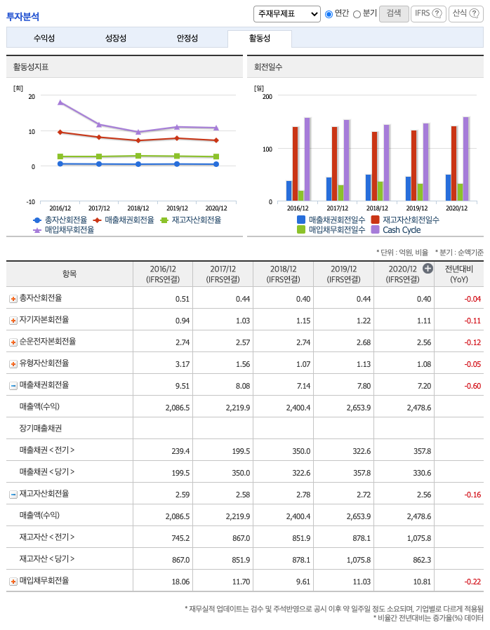 부채비율 : 2018년 약 181%, 2019년 약 173%, 2020년 약 179%로 증감을 오가고 있으며, 표준(100%)보다 높아 부채비율이 안정적이 않습니다.