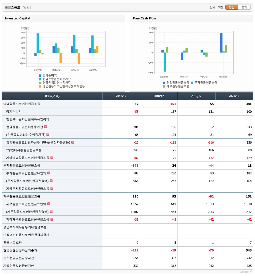 투자활동 현금흐름 : 2017년 -376억원, 2018년 34억원, 2019년 -44억원, 2020년 18억원으로 2017년과 2019년의 투자활동 현금흐름은 원활합니다.